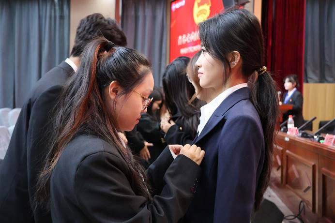 入团仪式在嘹亮的国歌声中开启,全场肃立,尽显青年朝气。武昱彤老师宣读新团员名单后,参会的老师们与各班团支书为新团员佩戴团徽。随后,组织部成员出团旗,全体新团员在主持人带领下共同宣誓,誓言铿锵有力。