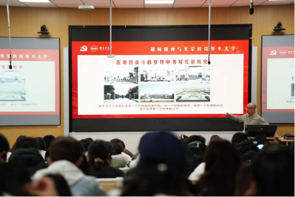 随后,胡书记以丰富的校史资料和鲜活的人物故事,带领同学们回溯塔大人艰苦奋斗的光辉历程。从建校初期的艰难创业,到逐步发展成为疆内知名的综合性大学,塔大始终坚守初心。在讲座中,胡书记着重对新时代内涵进行了解读,分析新时代为青年学子带来的机遇与挑战,勉励同学们在学好专业知识的同时要培养国际视野,提升综合素质。