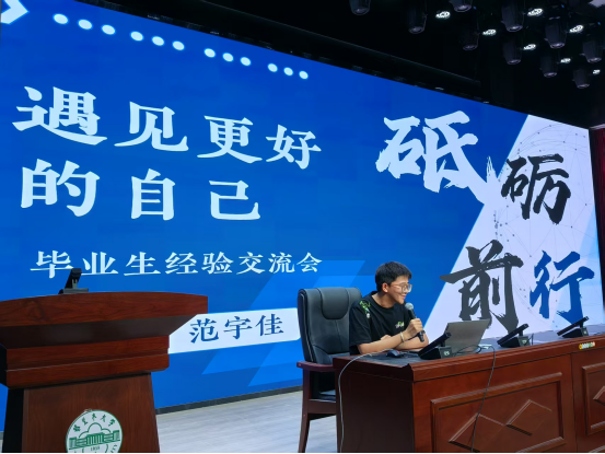 分享会上,杨银山老师介绍参与本次分享活动的优秀毕业生。毕业生们依次上台向同学们分享了各自的学习生活经验、就业选择,鼓励同学们在求学之路上注重提升自我能力,积极面对困难与挑战。